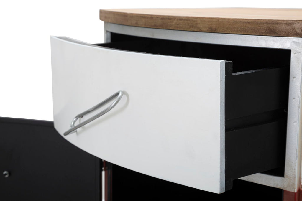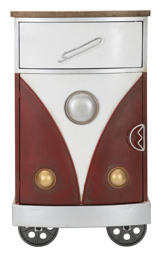 Table de chevet en métal avec plateau en bois avec porte et tiroir. Le design fait référence aux années 60 et à la culture hippie. Une touche vintage et industrielle pour créer un environnement raffiné.