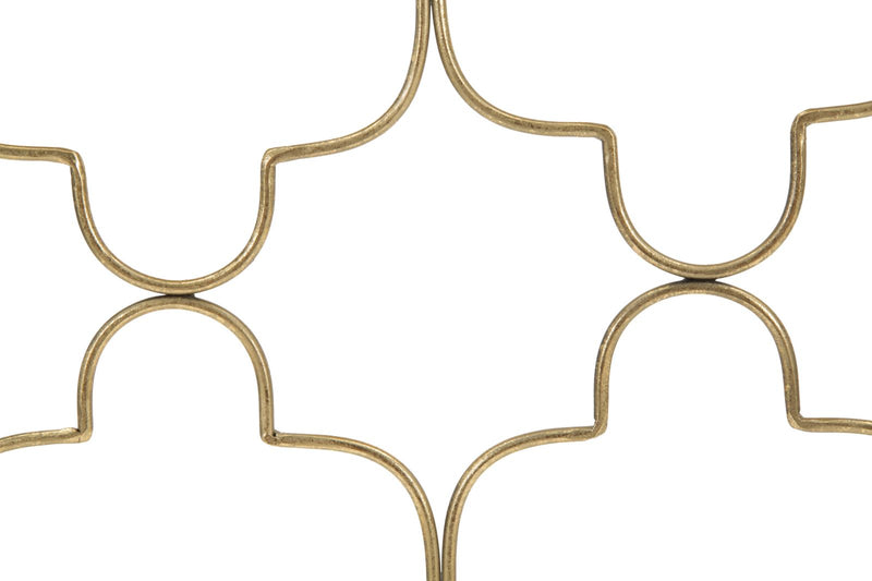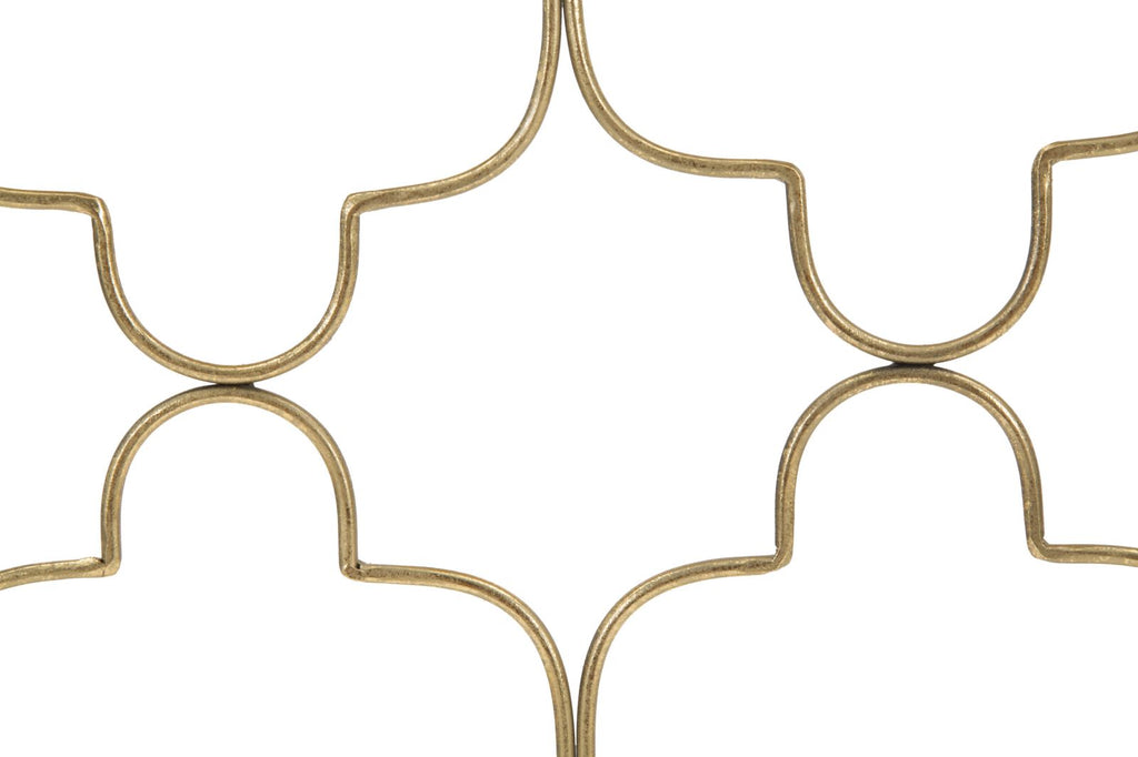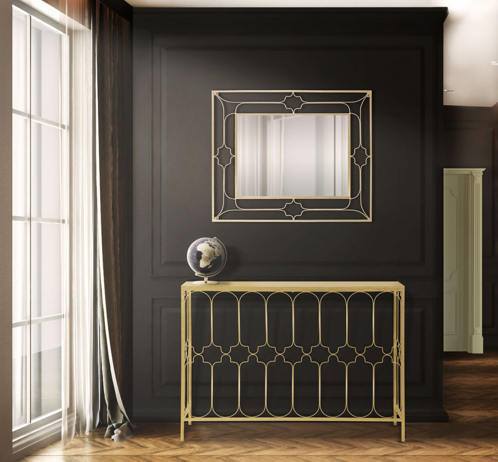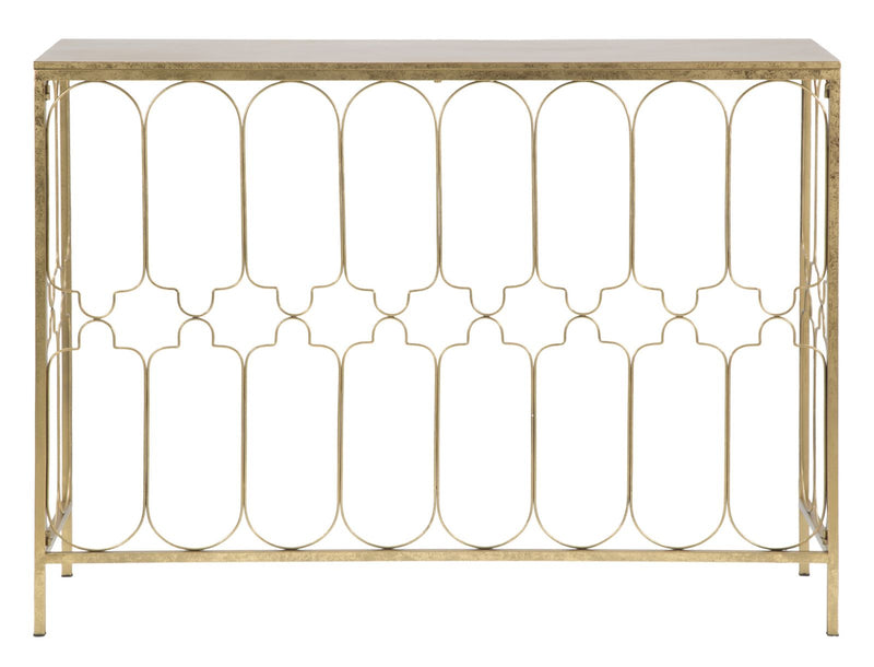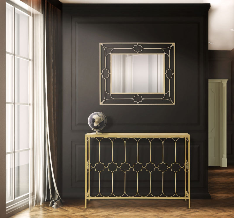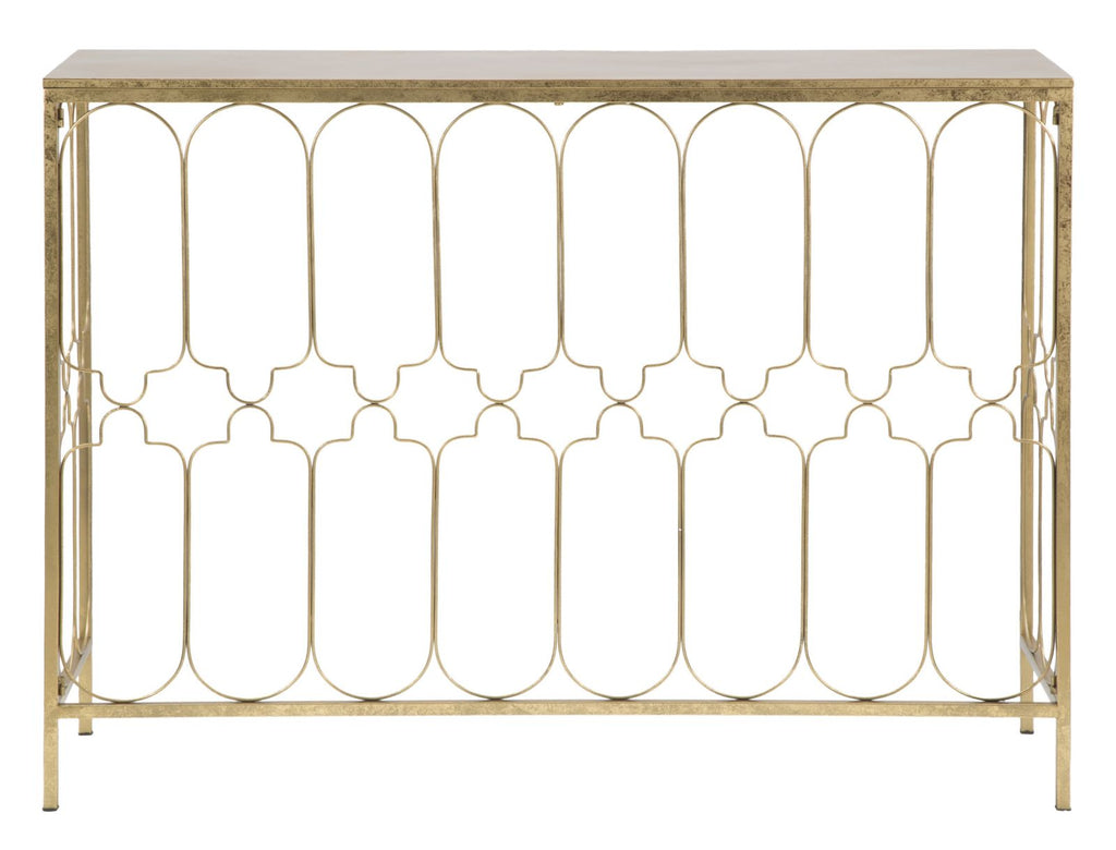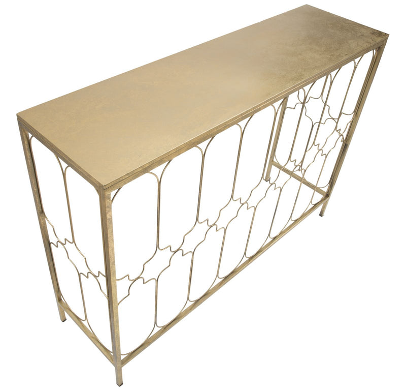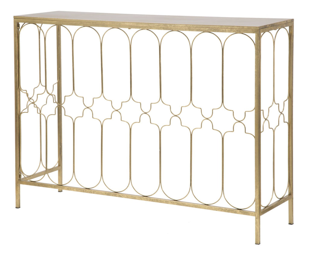Console rectangulaire en métal doré avec des décorations rappelant l'Orient. Une touche d'or ne peut manquer dans une maison glamour. La console est un élément qui devient un point de lumière dans n'importe quel environnement.