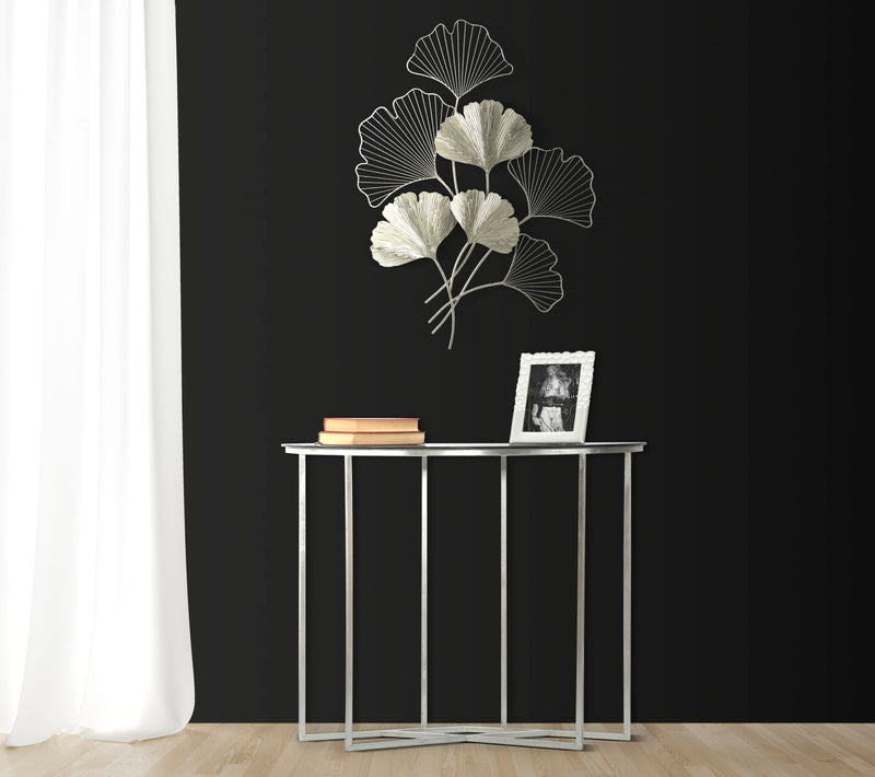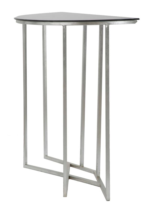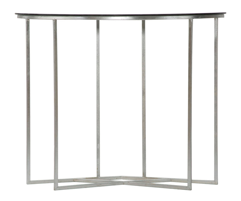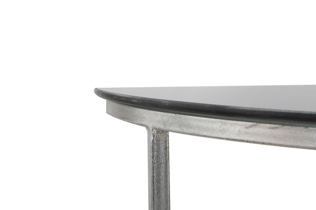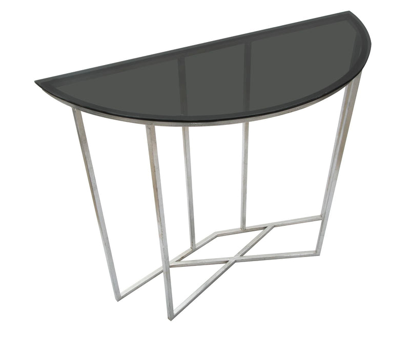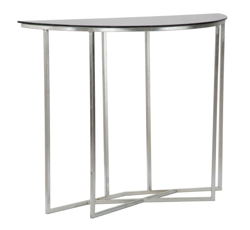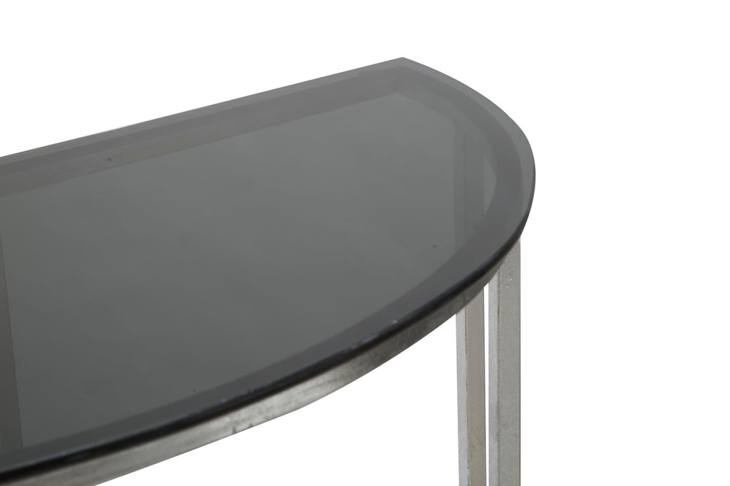Console semi-circulaire en métal argenté avec plateau en verre noir. Les lignes géométriques et régulières donnent élégance et style à chaque salon.