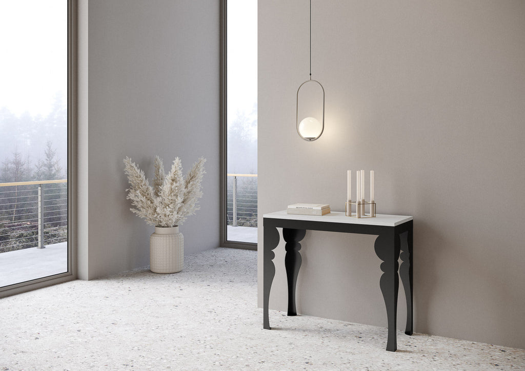 Paxon allungabile Small Evolution, una Consolle allungabile dal design moderno e riconoscibile. Particolartià di questo modello sono le particolari gambe finemente elaborate in modo arabesco nella forma. Una Consolle che si inserisce alla perfezione in qualunque ambiente, arricchendolo con la sua tipica raffinatezza. Paxon Small è dotata di un sistema a tre allunghe che gli permette di estendersi progressivamente fino a 196, una possibilità che la rende una Consolle dalla grande versatilità: piccola e maneggevole da chiusa, in poche mosse si trasforma in un pratico tavolo da pranzo di due metri. Il piano è in microparticelle di legno. Le allunghe sono della stessa finitura del piano. Un solido telaio in metallo lavorato a laser ad alta precisione, consente alla Consolle di rimanere stabile e affidabile anche quando completamente allungata. Il telaio in ferro è verniciato. Realizzata interamente in Italia mediante l'utilizzo di materiali 100% italiani. Dimensioni L.90 P.40 H.77 (allungabile fino a 196 cm)