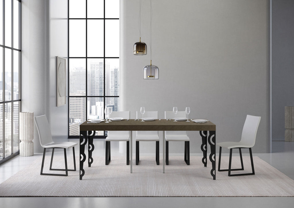 Consolle allungabile Karamay Small Premium, versatile e robusta, un complemento perfetto per ogni ambiente della casa: ingresso, cucina, sala da pranzo, soggiorno o corridoio. La consolle allungabile Karamay Premium Small può essere facilmente trasformata in un ampio tavolo da pranzo lungo fino a 196 cm, in grado di ospitare 10 persone. Realizzata con pannelli in nobilitato, gambe in ferro. Il sistema di allunghe con guide telescopiche in alluminio e il sostegno centrale in dotazione rendono la consolle stabile e robusta. Una volta che la consolle è chiusa, le allunghe devono essere riposte altrove.