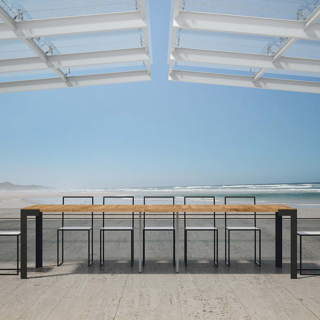 Consolle allungabile Azalea un concentrato di eleganza, design e praticità da inserire nel tuo giardino o all'interno della tua abitazione. Un telaio in metallo tagliato al laser sorregge un solido e robusto piano in legno listellare d'Abete, allungabile fino a 2,9 metri. Made in Italy.