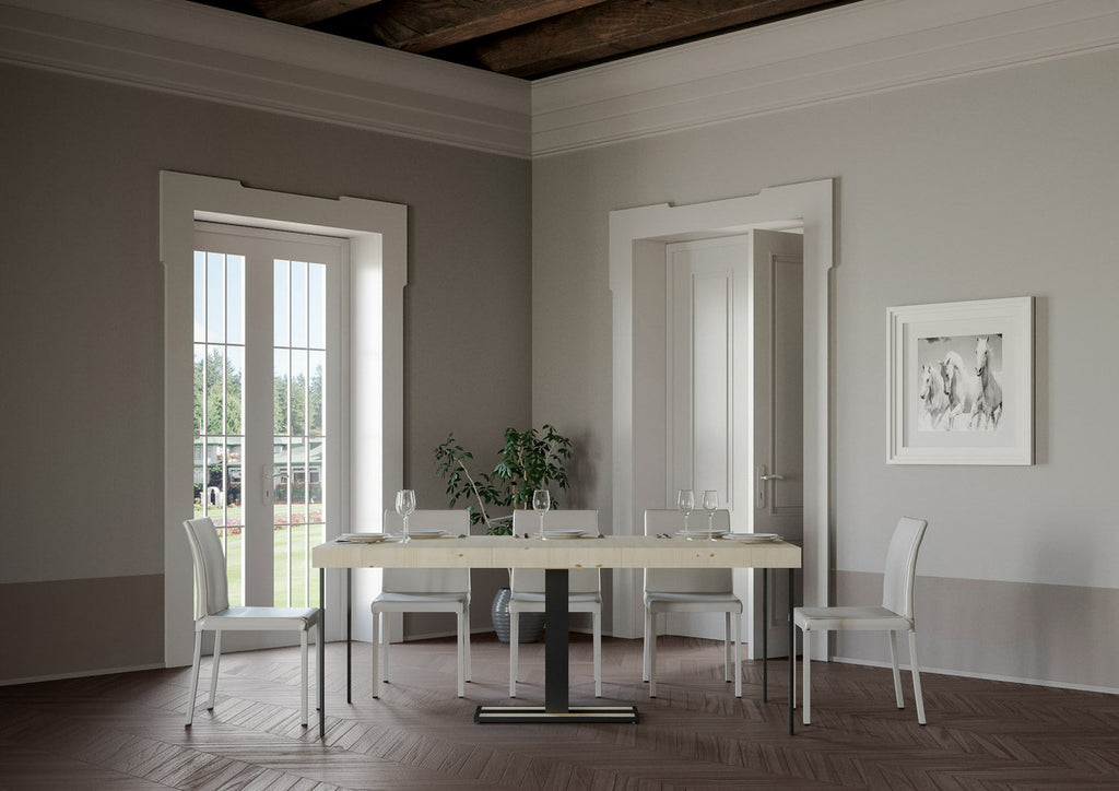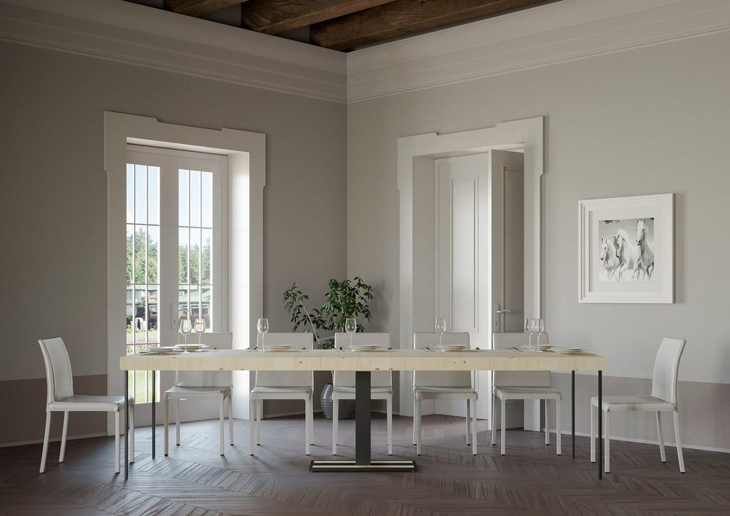 La console Capital Premium avec extensions pliantes en panneau latté d'épicéa est une table console raffinée pour meubler votre maison avec goût et design. La ligne originale rend la console parfaitement adaptable au mobilier de la maison, que ce soit dans un style classique ou moderne. Ce qui distingue la console Capital est la praticité avec laquelle il sera possible de la transformer d'une console simple et linéaire à une table à manger confortable et utile. Console capitale vous pouvez la placer dans la cuisine, dans la salle à manger ou dans le salon, elle pourrait être intéressante comme point d'appui dès l'entrée dans la maison si elle est placée dans l'entrée et pourquoi pas, avec un miroir au dessus et près d'un vase de fleurs.La fonctionnalité et la polyvalence se trouvent précisément dans la possibilité d'étendre la console Capital pour accueillir amis et parents dans les moments les plus importants à partager.Avec le système d'extension, en quelques étapes simples, vous transformerez l'espace petite console en grande table à manger : stable, résistante et robuste. La solidité de la structure en fer avec le plateau rabattable rend la console robuste et stable. Entièrement fabriquée en Italie.La console standard est fournie avec un support central avec deux supports au sol qui garantissent sa fonctionnalité.