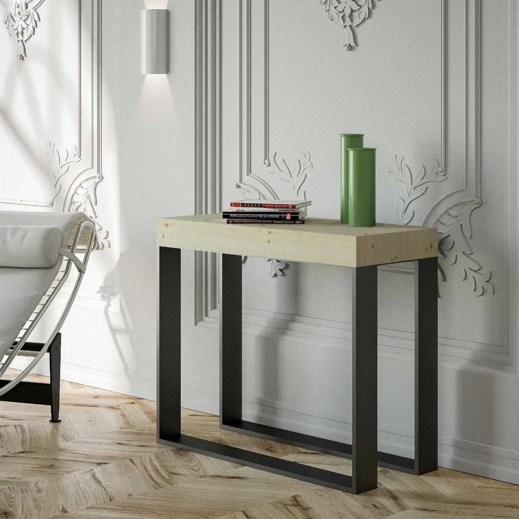 Console Elettra Premium. La console Elettra Premium en latté de sapin n'est pas seulement un élément d'ameublement. Pratique et fonctionnel grâce à la possibilité de l'étendre jusqu'à 290 cm. Elle se transforme rapidement en table multifonctionnelle, en table à manger, en table de travail, en table de salon. La Console, une fois fermée, peut être facilement placée dans votre entrée ou dans n'importe quel coin de votre maison. Facilement transportable, il s'intègre très bien dans n'importe quel espace. Un point d'appui pratique pour laisser les clés ou d'autres objets en entrant dans la maison. La robustesse et le design ne manquent pas, un ensemble de qualités qui se fondent dans la praticité d'un meuble qui a non seulement la caractéristique d'être belle. La polyvalence de la console Elettra donne la commodité de transformer un meuble discret en une table à manger pratique et stable. Quelques mouvements simples et vous aurez une table grande et spacieuse capable d'accueillir votre amis. Console Elettra, elle se transformera en une table extensible extraordinairement stable avec le support central. Structure en fer peint.
