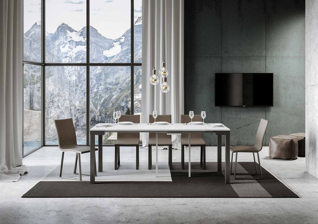 Everday Evolution, une console extensible capable de s'intégrer parfaitement dans tout type d'environnement, s'adaptant à tout style d'ameublement, grâce à son design fort et traditionnel. Il s'étend progressivement jusqu'à 300 cm, grâce au système à cinq extensions progressives. Une structure en fer peint qui soutient un plateau en bois raffiné. Le grand et solide cadre métallique travaillé au laser de haute précision constitue la structure porteuse de la console elle-même. Fabriqué entièrement en Italie avec des matériaux 100% italiens.