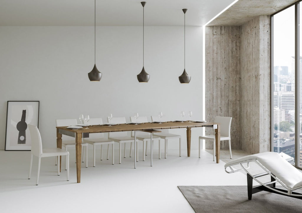 La console extensible Impero Iron est une variante de la console Impero classique. Elle tire son nom de la structure en fer sous le plateau qui confère à cette console un charme nouveau et moderne. Elle peut également très bien être positionnée dans un intérieur moderne.La combinaison du métal et du bois rend la console non seulement belle à regarder, mais aussi résistante pour les usages les plus variés. Les pieds de la console Impero Iron sont en bois massif tandis que le plateau et les rallonges sont des panneaux de microparticules de bois utilisant des colles sans formaldéhyde. Structure en fer peint Fabriqué en Italie. La console Impero Iron est équipée de 5 extensions. Ces rallonges permettent d'étendre la Console jusqu'à 300 cm et d'accueillir autant d'amis que vous souhaitez inviter chez vous. Les rallonges standards mesurent 52 x 90 cm chacune et sont incluses dans le prix. Avec ce système vous aurez la possibilité d'ajuster la longueur de la console toujours en fonction des besoins du moment. La stabilité de la console Impero Iron, lorsqu'elle est complètement déployée, est garantie par le système de support central avec 2 supports au sol. Ce support est inclus dans le prix.