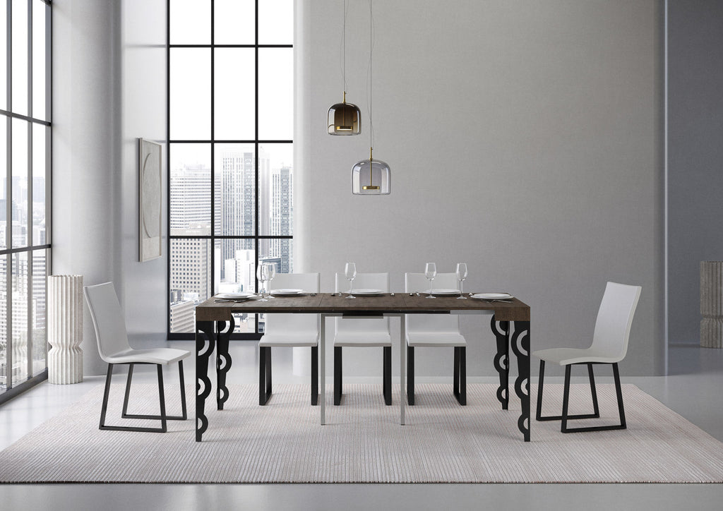 Karamay, une console extensible jusqu'à 3 mètres avec 5 rallonges au style incomparable grâce à la ligne douce de ses pieds. Un modèle capable de donner du caractère à tout type d'environnement. Compact et maniable, il peut être placé dans une entrée, un couloir, une entrée, un salon, un bureau ou une chambre. Grâce au système de cinq rallonges, elle s'étend progressivement jusqu'à 300 cm, se transformant en une table à manger spacieuse pouvant accueillir jusqu'à 14 personnes. Une console aux possibilités d'utilisation infinies. Les rallonges sont dans la même finition que le plateau. Le cadre métallique robuste et travaillé au laser de haute précision constitue la structure porteuse de la console elle-même, garantissant stabilité et fiabilité même dans son extension maximale. La structure en fer est disponible dans la version peinte. Fabriqué entièrement en Italie avec des matériaux 100% italiens. Dimensions L.90 P.40 H.77 (extensible jusqu'à 300 cm)