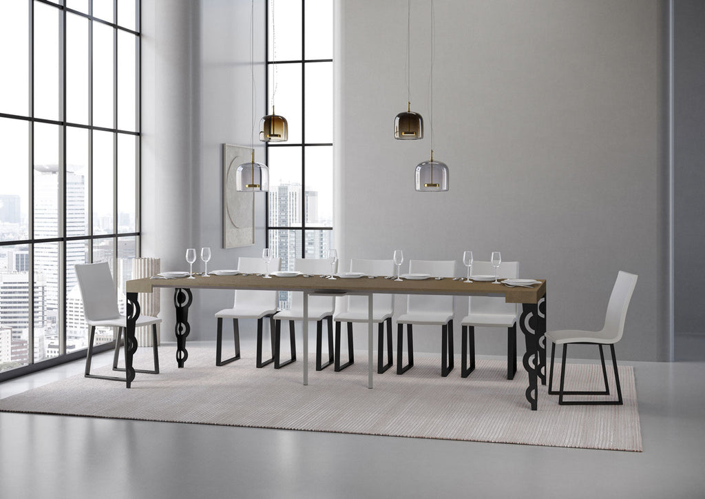Consolle allungabile Karamay, versatile e robusta, un complemento perfetto per ogni ambiente della casa: ingresso, cucina, sala da pranzo, soggiorno o corridoio. La consolle allungabile Karamay può essere facilmente trasformata in un ampio tavolo da pranzo lungo fino a 300 cm, in grado di ospitare 14 persone. Realizzata con pannelli in nobilitato, gambe in ferro. Il sistema di allunghe con guide telescopiche in alluminio e il sostegno centrale in dotazione rendono la consolle stabile e robusta. Una volta che la consolle è chiusa, le allunghe devono essere riposte altrove.