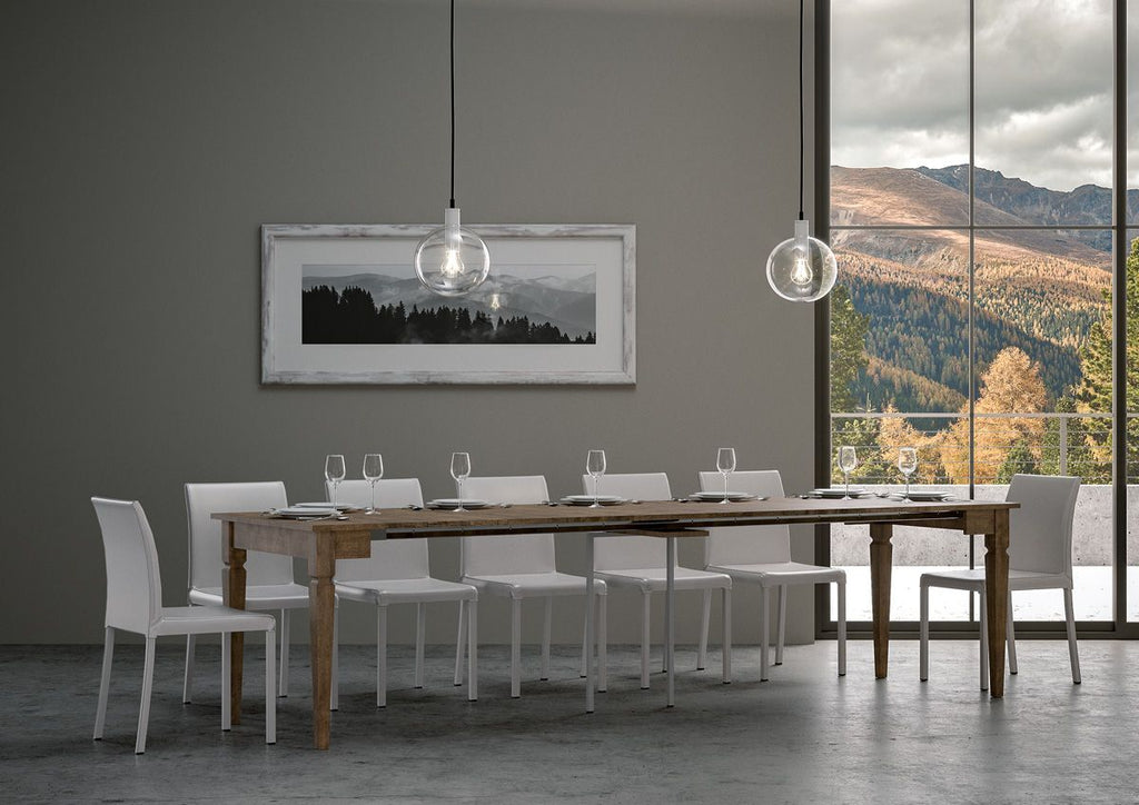 La console extensible Classic Empire surprend par sa beauté et son originalité, tout en conservant un style classique et toujours élégant. Le design fera la différence dans votre maison, le bois rendra votre pièce raffinée et accueillante. Les pieds de la Console Sabre sont en bois de hêtre massif tandis que le plateau et les rallonges sont des panneaux de microparticules de bois utilisant des colles sans formaldéhyde. Cependant, l’une des principales caractéristiques de la console Impero est qu’elle est équipée de 5 extensions. Ces extensions vous permettent d'allonger la Console et d'accueillir autant d'amis que vous souhaitez inviter chez vous. Les rallonges standards mesurent chacune 52 x 90 cm et sont incluses dans le prix. Avec ce système vous aurez la possibilité d'ajuster la longueur de la console toujours en fonction des besoins du moment. Les dimensions de la console Sabre allongée : Avec une longueur d'extension de cm. 100, Avec deux rallonges Longueur de cm. 152, Avec trois rallonges Longueur de cm. 204, Avec la quatrième extension Longueur de cm. 256, Avec la cinquième extension Longueur de cm. 308, la largeur et la hauteur restent toujours inchangées (L. 90 x H. 77). La stabilité de la console Impero, lorsqu'elle est complètement déployée, est garantie par le système de support central avec 2 supports au sol. Cette prise en charge est incluse dans le prix.