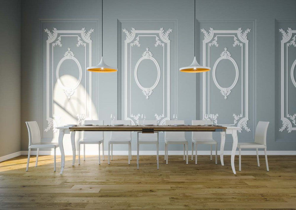 Console extensible classique de style Bassano, structure des étagères et extensions en contreplaqué de peuplier utilisant des colles sans formaldéhyde, pieds en peuplier massif ou en hêtre.