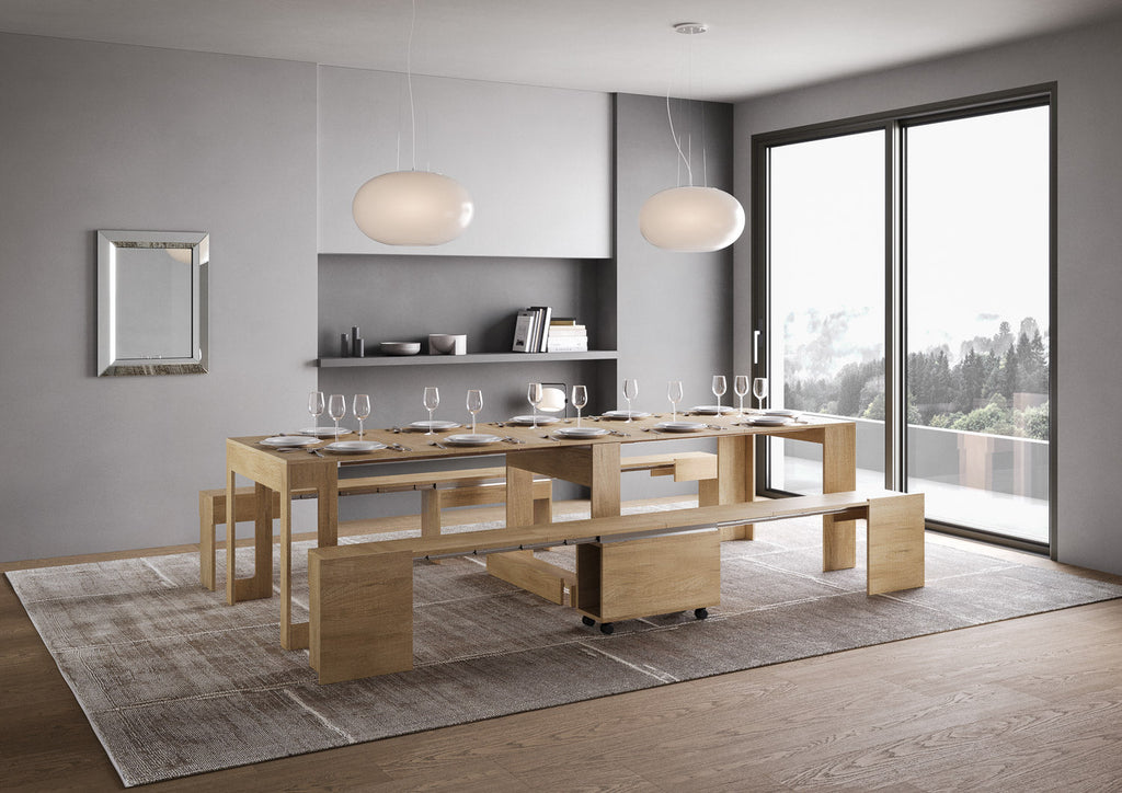 Consolle allungabile Evolve con due panche allungabili. Quando chiusa, la consolle contiene al suo interno due panche allungabili: una soluzione multifunzionale estremamente pratica per far fronte ad ogni esigenza di spazio. Consolle e panche occupano poco spazio quando chiuse e possono essere collocate in un ingresso, cucina, sala da pranzo, soggiorno o corridoio. Quando aperta, la consolle allungabile Evolve si trasforma in poche e semplici mosse in un ampio tavolo da pranzo lungo fino a 302 cm, in grado di accomodare 14 persone, che possono trovare posto direttamente sulle panche fornite in dotazione. La consolle è dotata di 5 allunghe da 52 cm ciascuna. Quando non utilizzate, le allunghe possono essere riposte all’interno di un pratico vano porta allunghe posto sul retro della consolle. Ogni panca è dotata di 4 allunghe da 57cm ciascuna. Quando non utilizzate, le allunghe delle panche vengono riposte in un comodo contenitore ricavato nella struttura della panca inferiore. La panca inferiore è dotata di rotelle per essere spostata con facilità. Realizzata con pannelli in nobilitato. Il meccanismo di estensione con guide telescopiche in alluminio e il sostegno centrale integrato alla struttura rendono la consolle stabile e robusta anche quando aperta alla massima estensione.