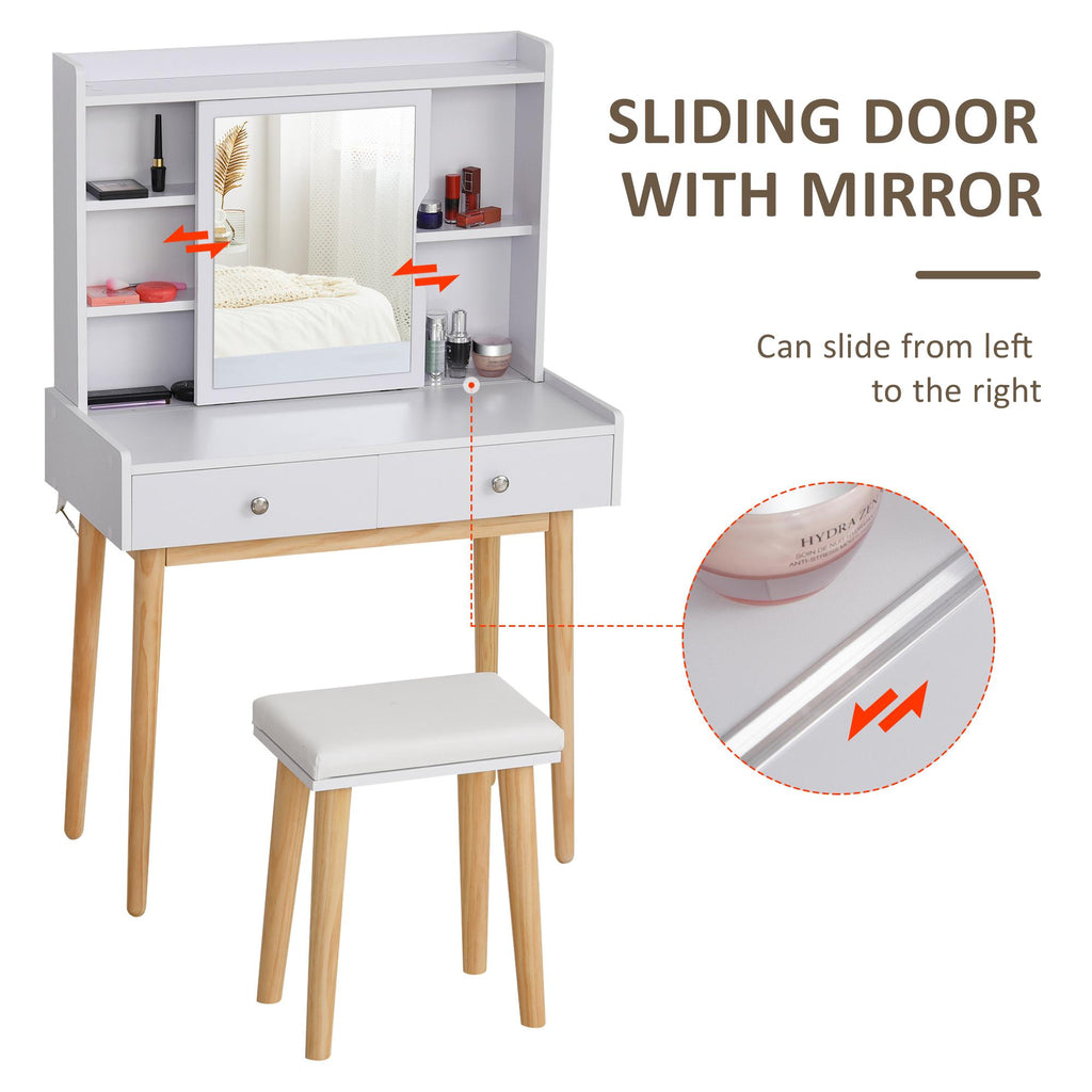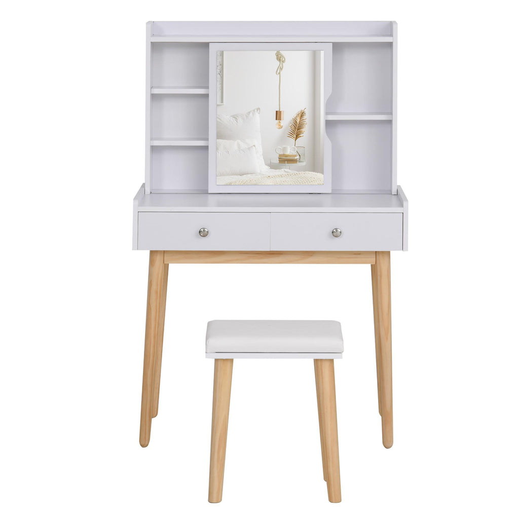 Cette coiffeuse chic est un excellent ajout à votre chambre à coucher, avec un miroir coulissant et un tabouret rembourré. Il dispose de 2 tiroirs et de 5 compartiments de rangement pour ranger vos bijoux et cosmétiques. Le tabouret est équipé d'un coussin qui le rend confortable. La table est en aggloméré et les pieds sont en bois de pin pour plus de solidité. Cet ensemble de coiffeuse est élégant et convient à tout décor de pièce.
