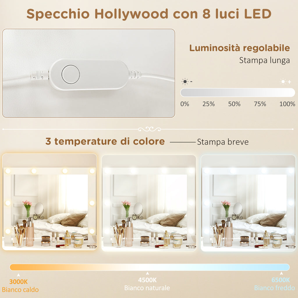 Consolle Trucco con Specchio Stile Hollywood 8 Luci LED con 7 Cassetti e Sgabello Imbottito in Legno Bianco