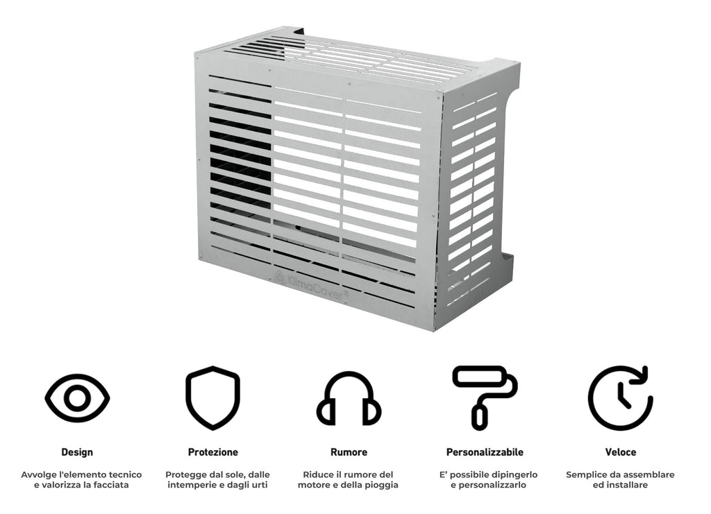 Se hai il climatizzatore sul balcone, sul terrazzo o in una zona di passaggio e vuoi renderlo più bello alla vista questa copertura è quella che ti serve. Il design sobrio ed elegante si adatta con ogni tipo d’arredo esterno e la lamiera in alluminio preverniciato di qualità 100% Made in Italy resiste praticamente a tutto. Non arrugginisce, non teme il freddo, il calore, le intemperie ed è indeformabile. Facile e veloce da montare, il copri condizionatore Classic protegge e ripara l’unità esterna del climatizzatore dagli agenti atmosferici ma anche da urti accidentali e manomissioni senza comprometterne il funzionamento. La circolazione dell’aria è garantita infatti dalle feritoie di aerazione presenti lungo tutta la struttura.