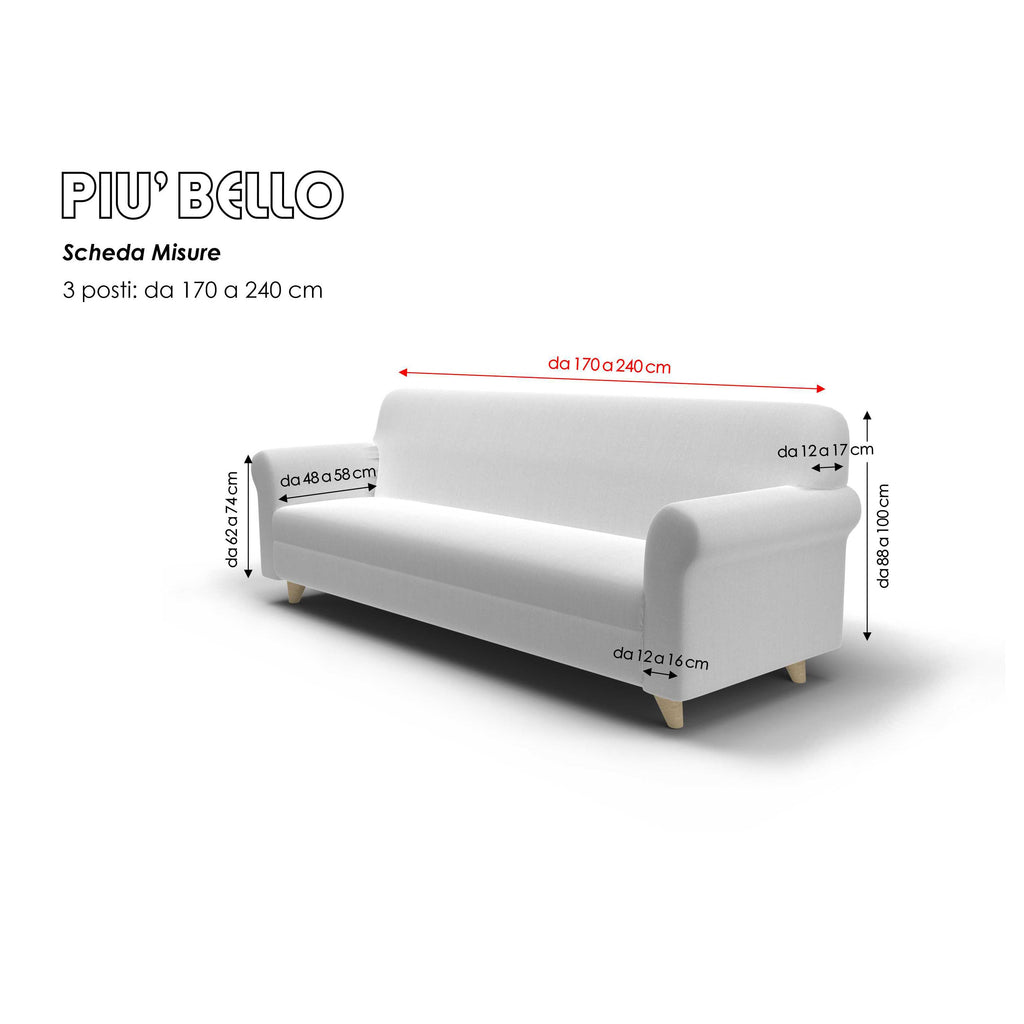 Housse de canapé en forme de structure lisse bi-élastique PLUS BEAU! Fait de tissus d' ameublement raffinés avec des finitions soignées et des tailles abondantes qui font de ce produit un vêtement prestigieux, transformant l'atmosphère de votre salon en un seul geste, le rendant plus élégant et accueillant. Cousu avec des coutures résistantes à la traction et invisibles avec une bande élastique périmétrique à la base pour adhérer parfaitement au canapé.