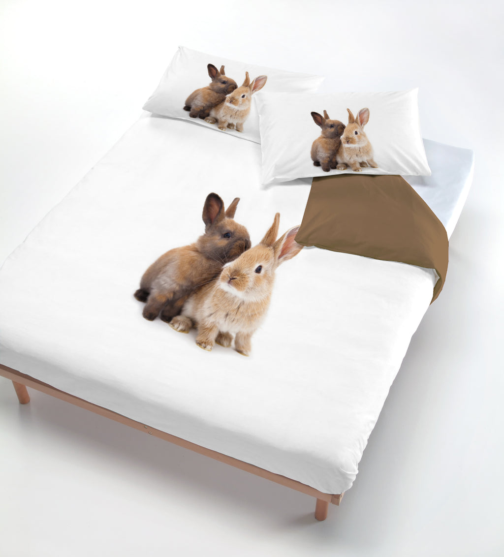 Housse de couette avec impression sur le sac et taies d'oreiller Lapins marron
