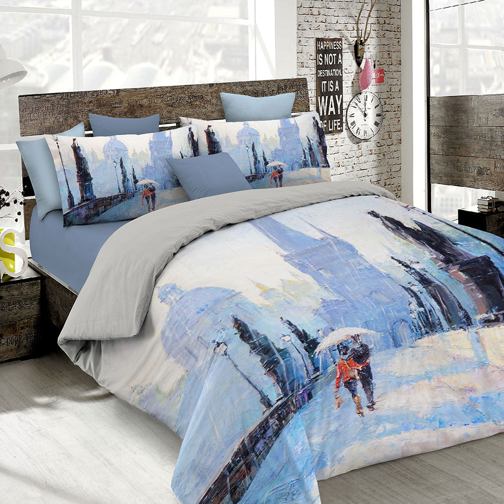 Parure de lit imprimée numériquement composée d' une housse de couette et de taies d'oreiller . Idéal pour ceux qui veulent habiller leur lit avec des images originales et uniques. Cette collection est représentée par des produits de haute qualité caractérisés par des impressions numériques sur des tissus 100% coton qui mettent en valeur chaque détail de l'image qui est lumineuse, définie et surtout solide au lavage. Étudié, assemblé et cousu entièrement en Italie , l'imprimé est positionné au centre du sac et des taies d'oreiller.