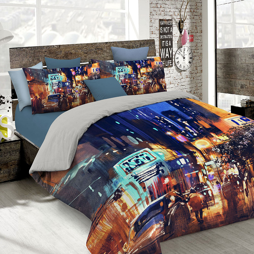 Parure de lit imprimée numériquement composée d' une housse de couette et de taies d'oreiller . Idéal pour ceux qui veulent habiller leur lit avec des images originales et uniques. Cette collection est représentée par des produits de haute qualité caractérisés par des impressions numériques sur des tissus 100% coton qui mettent en valeur chaque détail de l'image qui est lumineuse, définie et surtout solide au lavage. Étudié, assemblé et cousu entièrement en Italie , l'imprimé est positionné au centre du sac et des taies d'oreiller.