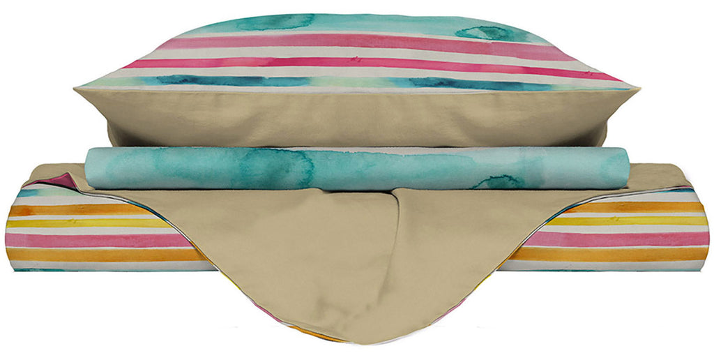 - Double : Housse de couette 250 x 200 cm + double rabat à fixer sous le matelas + 2 taies d'oreiller 52 x 82 cm + rabat intérieur