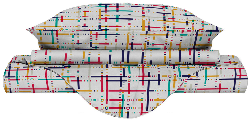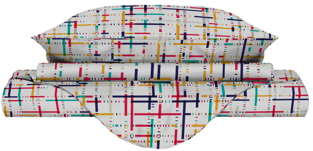 - Double : Housse de couette 250 x 200 cm + double rabat à fixer sous le matelas + 2 taies d'oreiller 52 x 82 cm + rabat intérieur