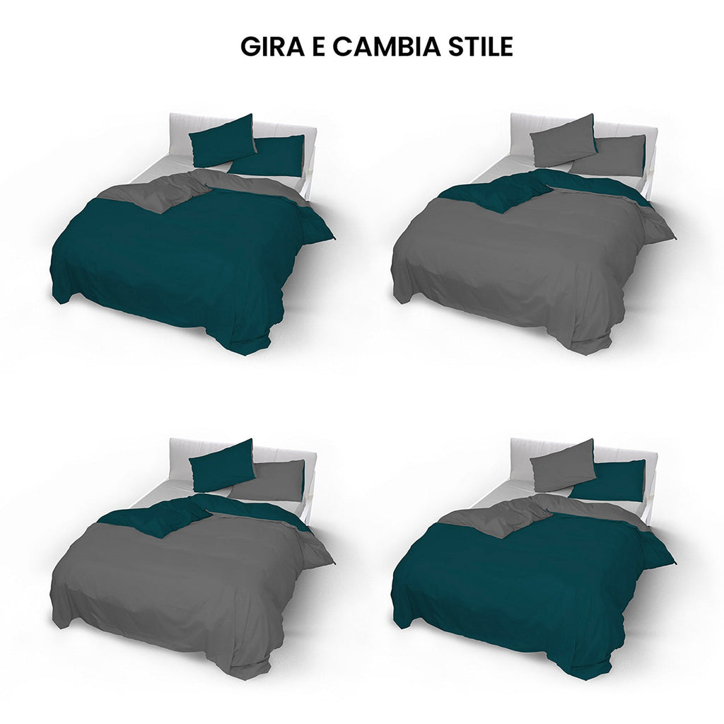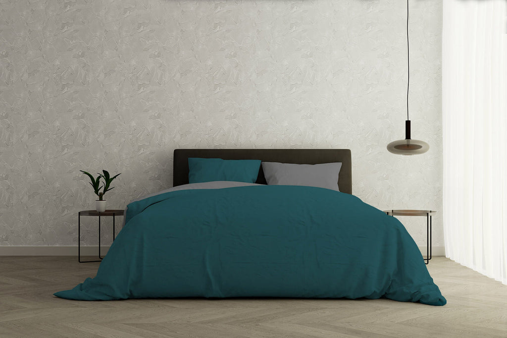 Housse de couette avec sac et taies d'oreiller réversibles vert pétrole/fumée