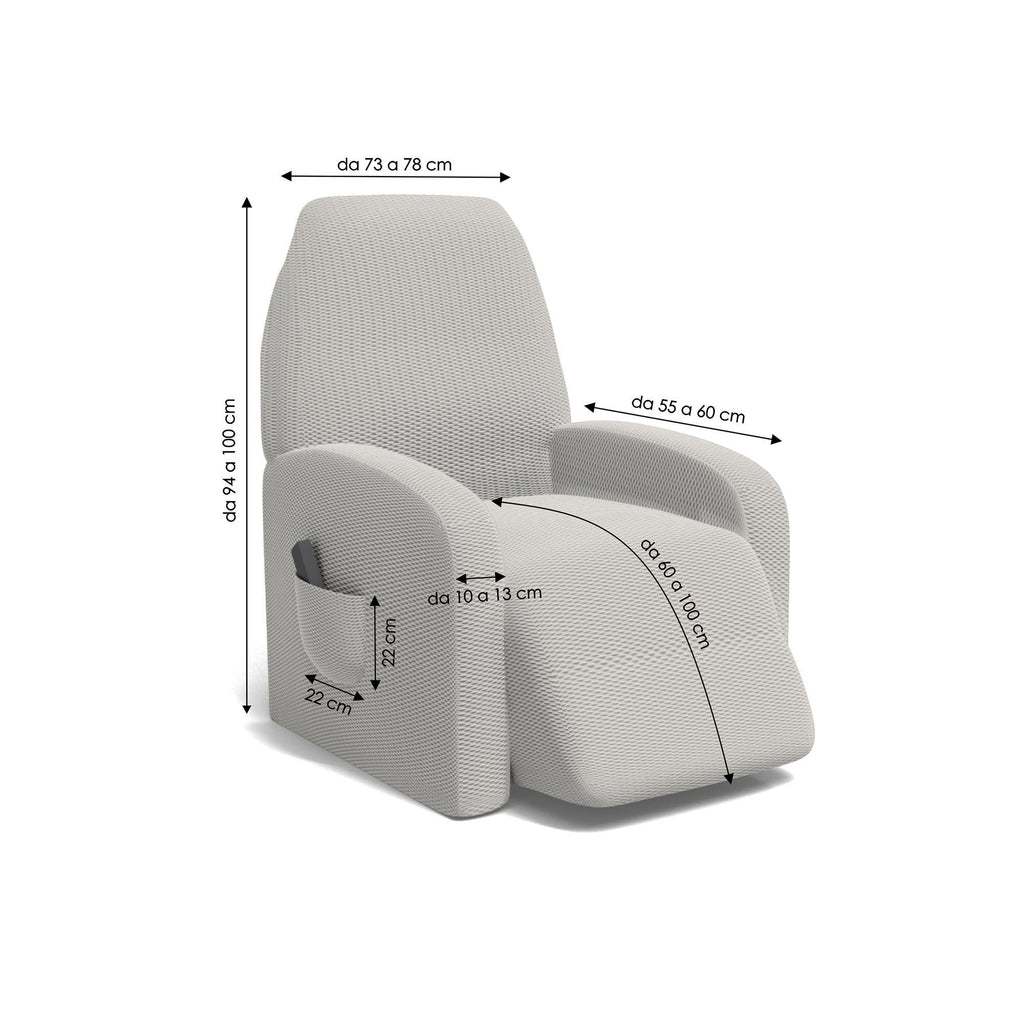 Housse élastique pour fauteuil inclinable. Article muni de poche et muni de barres de fixation à la chaise. Produit extensible et de taille standard.