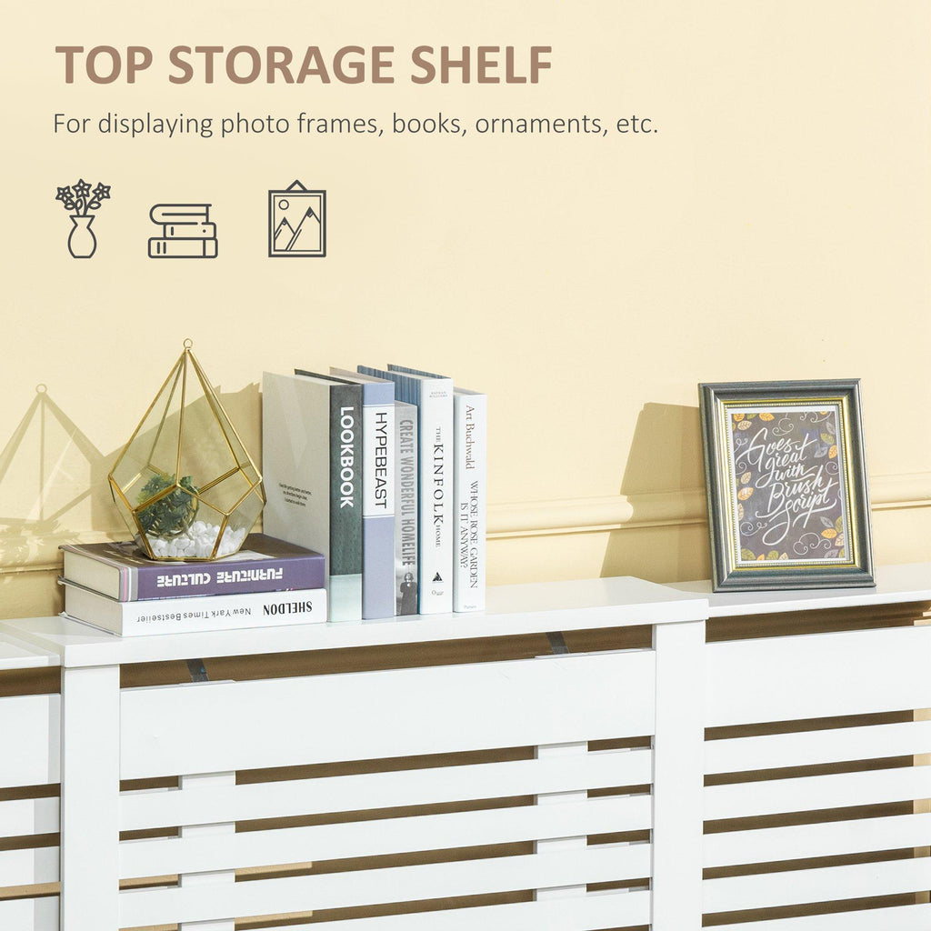 - ÉTAGÈRE SUPÉRIEURE : L'étagère située au-dessus du cache-radiateur en bois vous offre un espace pratique pour placer des décorations, des livres, etc. La structure est en MDF, ce qui la rend solide et durable.