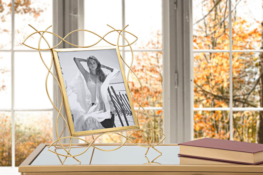 La cornice portafoto in metallo dorato è un'opera di grande eleganza. Il suo design morbido e le linee sinuose accentuano la bellezza di ogni immagine al suo interno. Questa cornice è in grado di trasformare ogni ricordo in un vero e proprio capolavoro, donando un tocco di classe a qualsiasi ambiente. Un oggetto dal fascino senza tempo.
