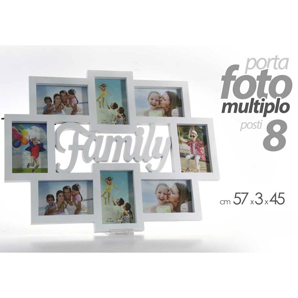 Questa bellissima cornice portafoto è realizzata interamente in plastica di altissima qualità ed è fornita di ben 8 posti portafoto formato 10 x 15 cm decorata con una bellissima scritta Family in corsivo posta al centro tra le foto