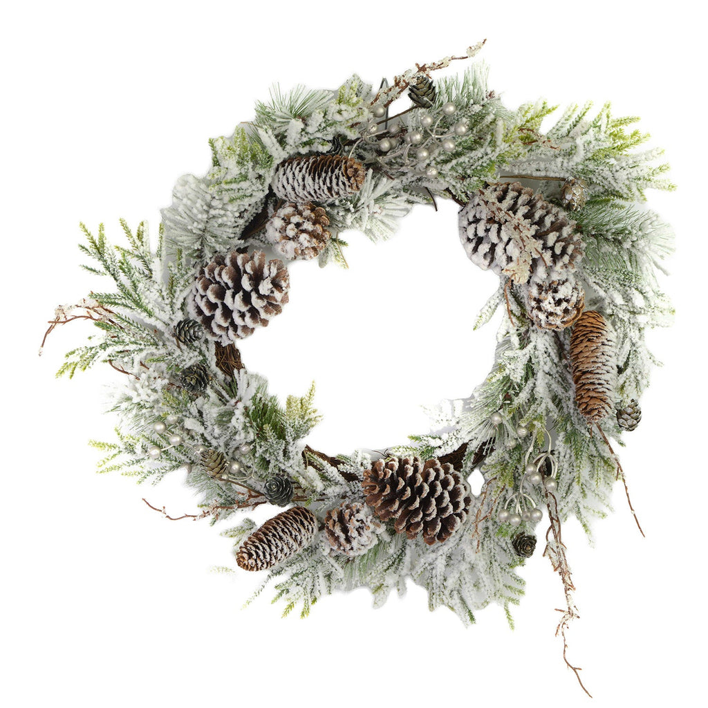 Couronne enneigée avec pommes de pin vertes Ø58 cm