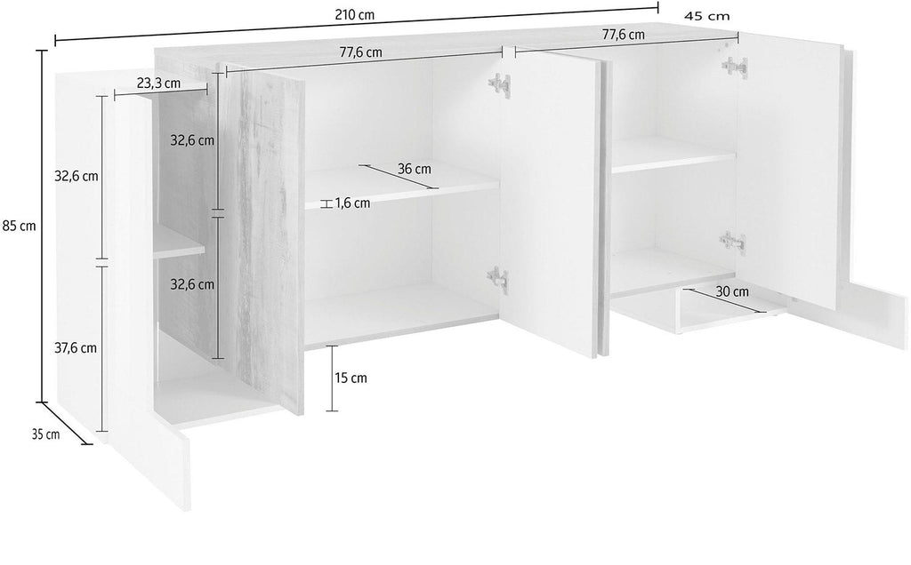 - Dimensioni del mobile montato: 210 x 45 x 85 cm (LxPxA)