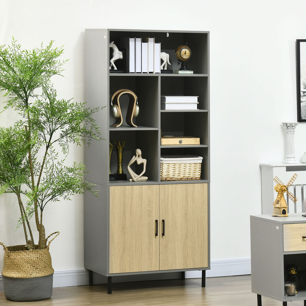Buffet 6 étagères 2 portes 76x40x179 cm en aggloméré gris et chêne