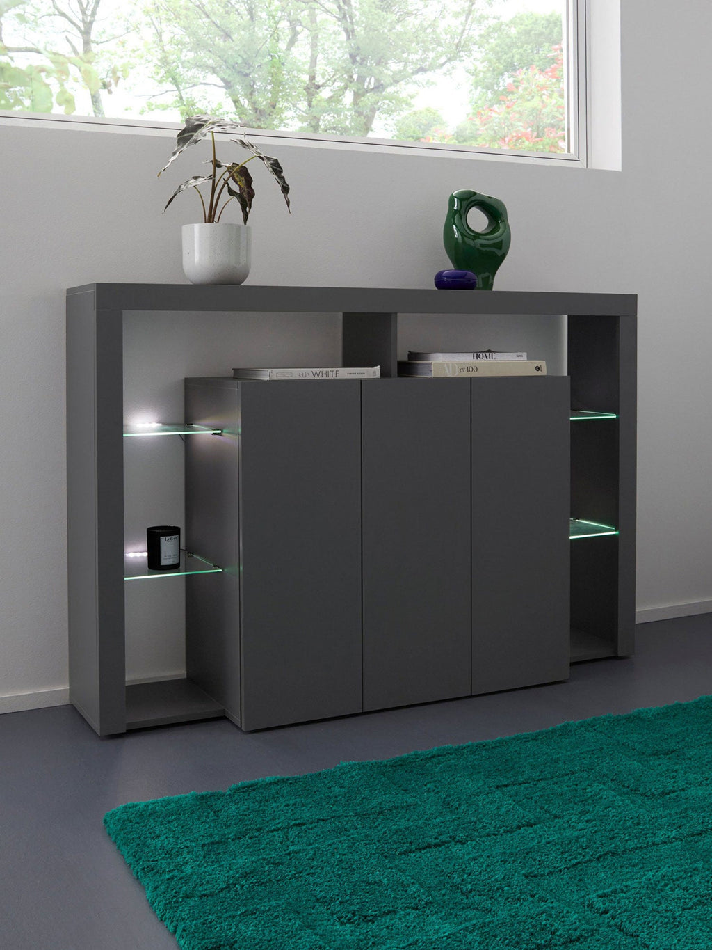 Credenza con 3 Ante e Ripiani in Vetro a Giorno 150x40x100 cm Essential 3A Grigio Antracite Opaco