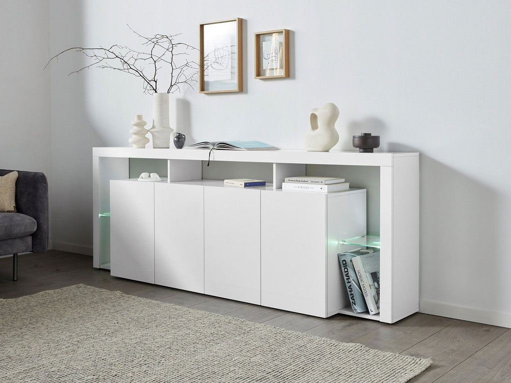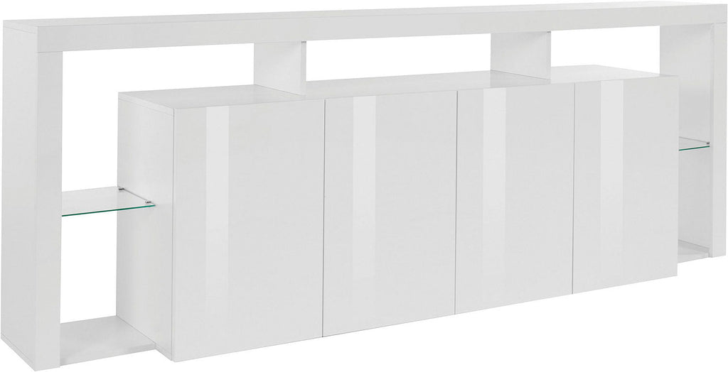 Credenza con 4 Ante e Ripiani in Vetro a Giorno 220x40x80 cm Essential 3A Bianco Lucido
