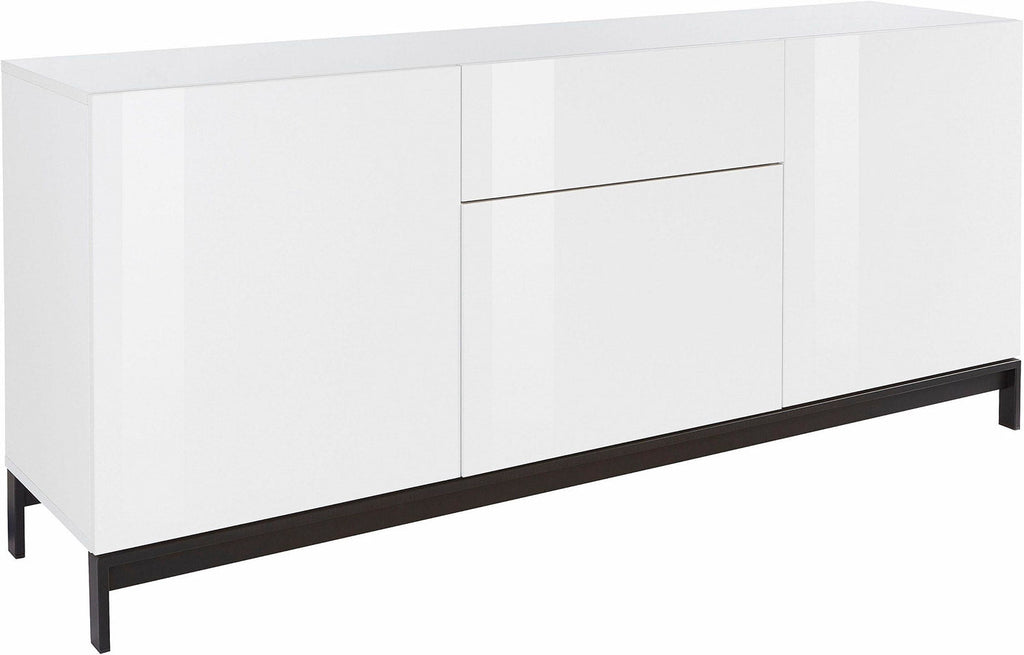 La credenza METIS con piedi, 3 ante e 1 cassetto è un mobile che si fa notare per il design lineare e moderno, la finitura lucida e il piedistallo con piedini in metallo verniciato nero.