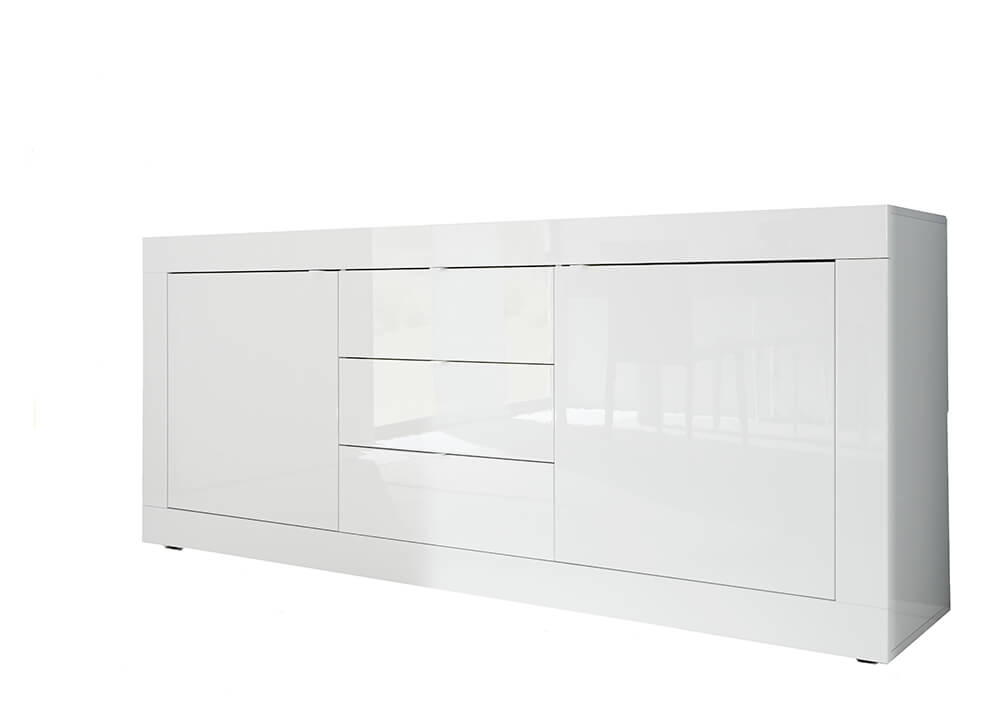 Buffet Meuble de Salon 2 Portes 3 Tiroirs 210x43x86cm TFT Basic Blanc Brillant