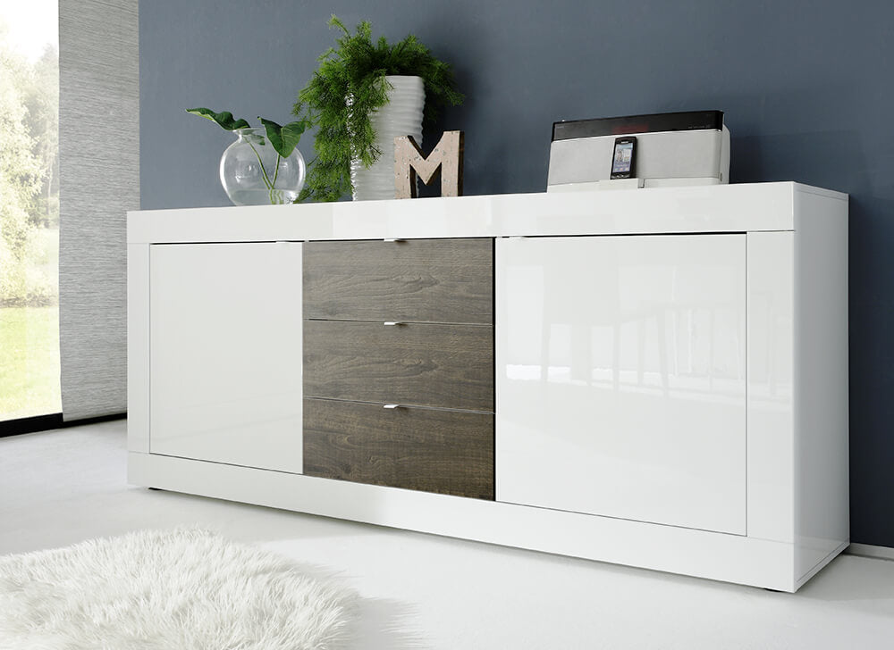 Buffet Meubles de Salon 2 Portes 3 Tiroirs 210x43x86cm TFT Basic Chêne Blanc Brillant Wengè