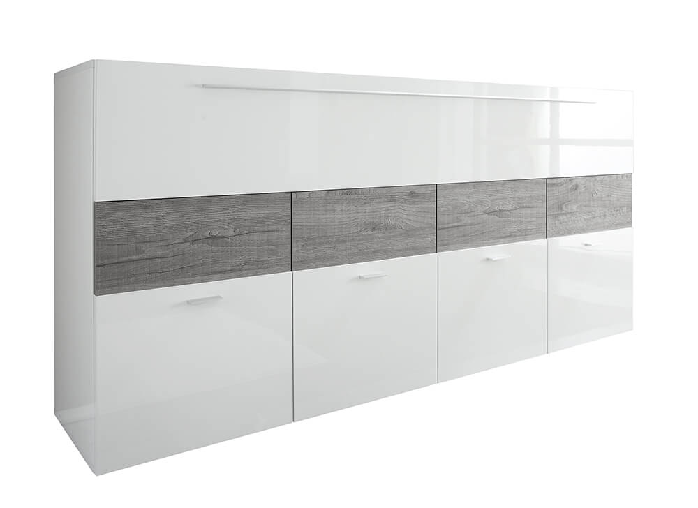 Buffet Meuble de Salon 4 Portes 1 Abattant 85x161x43cm TFT Cube Chêne Blanc Brillant et Gris