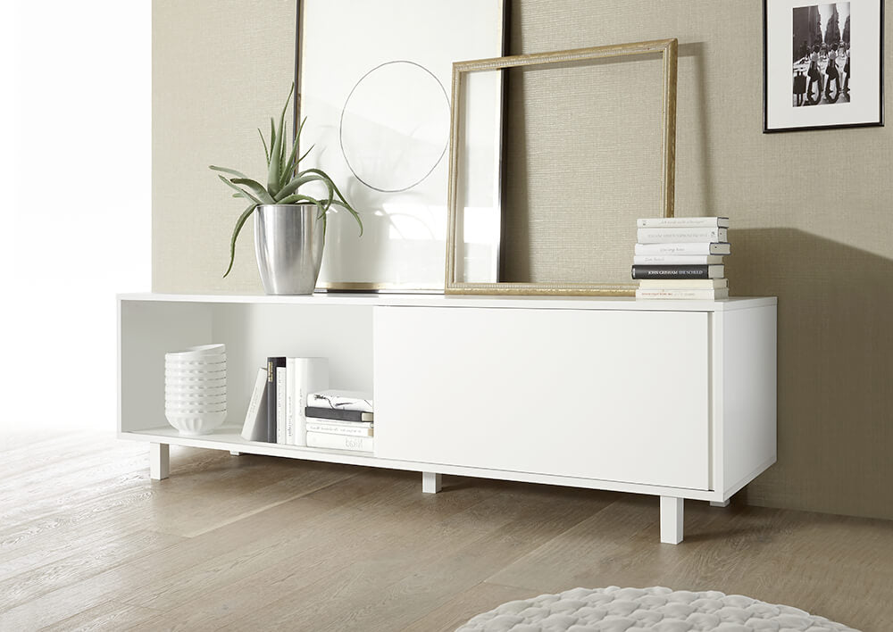 Buffet Meuble De Salon Avec 2 Tiroirs Et 1 Porte Coulissante En Mélamine 206x50x63cm TFT Aladdin Blanc Mat