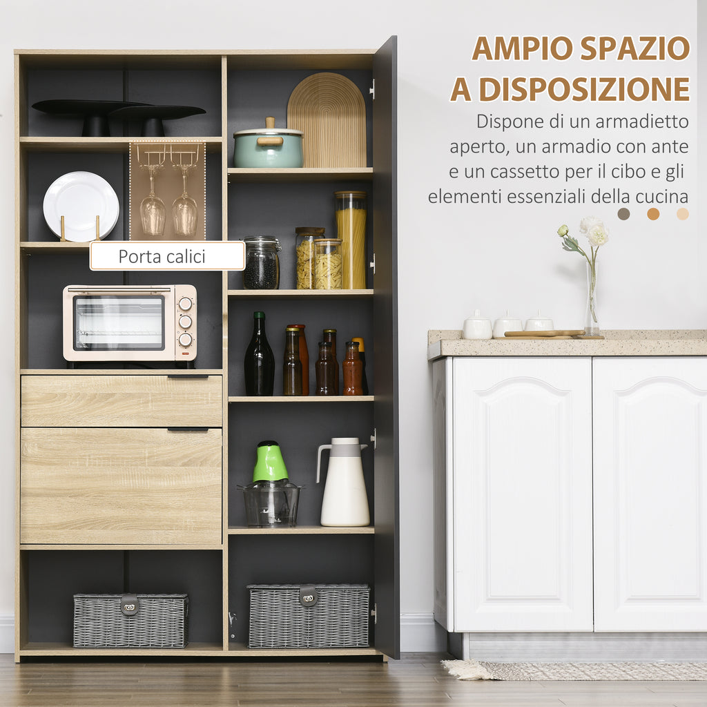 Credenza Moderna da Cucina 110x41,5x180 cm con Armadietto Cassetto e Porta Calici in MDF Legno Naturale e Grigio