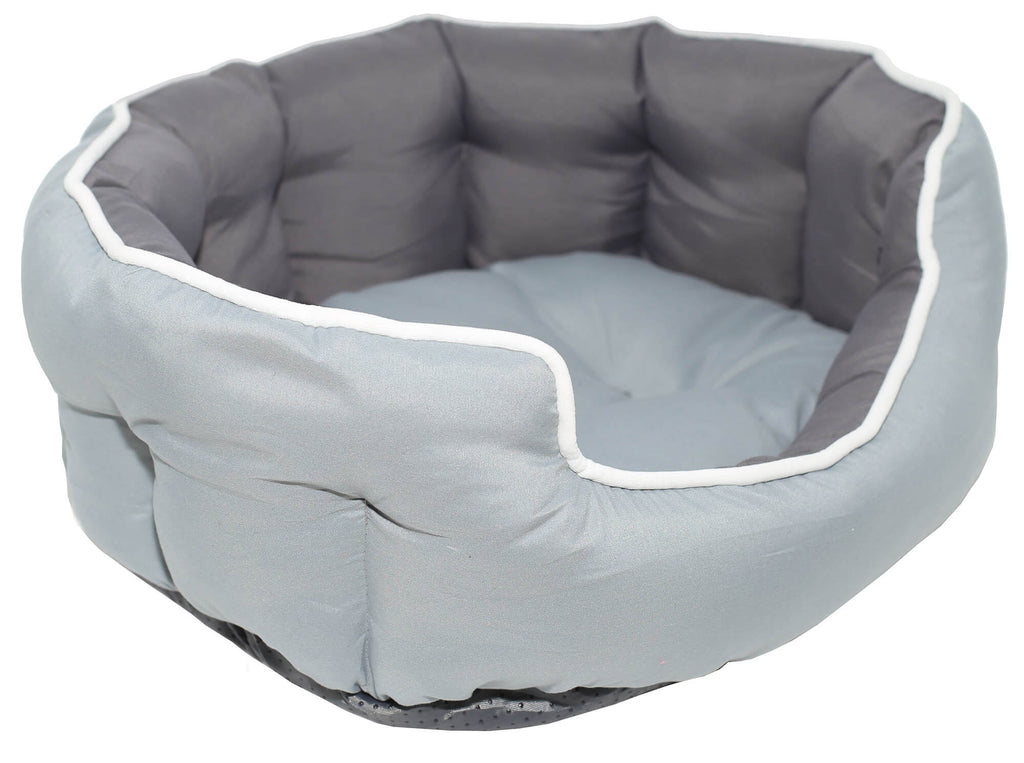 Niche pour chiens et chats avec dos antidérapant imperméable pour ne pas rendre l'article glissant lorsque le chien entre et sort. Traitement des bords de la même couleur et sommier matelassé pour chien.
