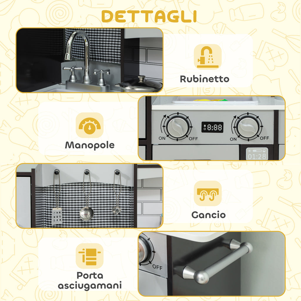 Cucina Giocattolo per Bambini 3-8 Anni con Accessori Frigo Lavandino e Suoni in Legno Marrone
