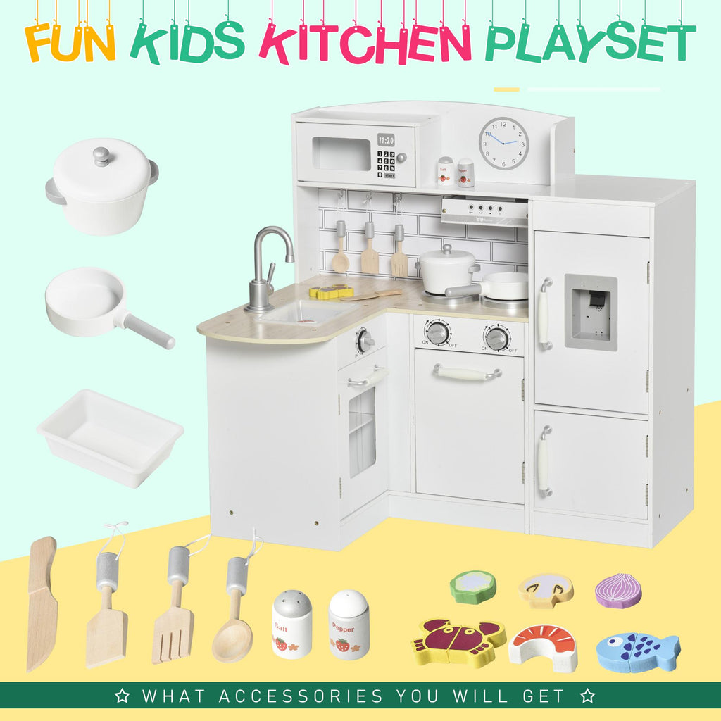 - ENSEMBLE COMPLET : Cette cuisine jouet d'angle est livrée avec un ensemble complet d'accessoires, qui comprend : 1 couteau, 1 fourchette, 2 cuillères, 1 poêle à frire, 1 casserole, des récipients à sel et à poivre, 1 crabe, 1 oignon, 1 champignon, 1 crevette. , 1 poisson, 1 brocoli. Le bloc avec réfrigérateur peut être détaché et placé où vous le souhaitez.