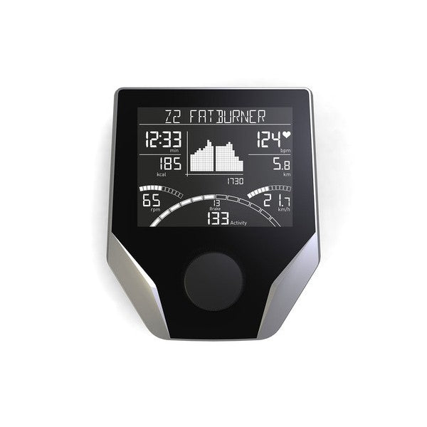 - Affichage continu des fonctions (temps, distance, vitesse, RPM, calories brûlées, watts et fréquence cardiaque) paramétrables plus une matrice graphique pour afficher le parcours d'entraînement.