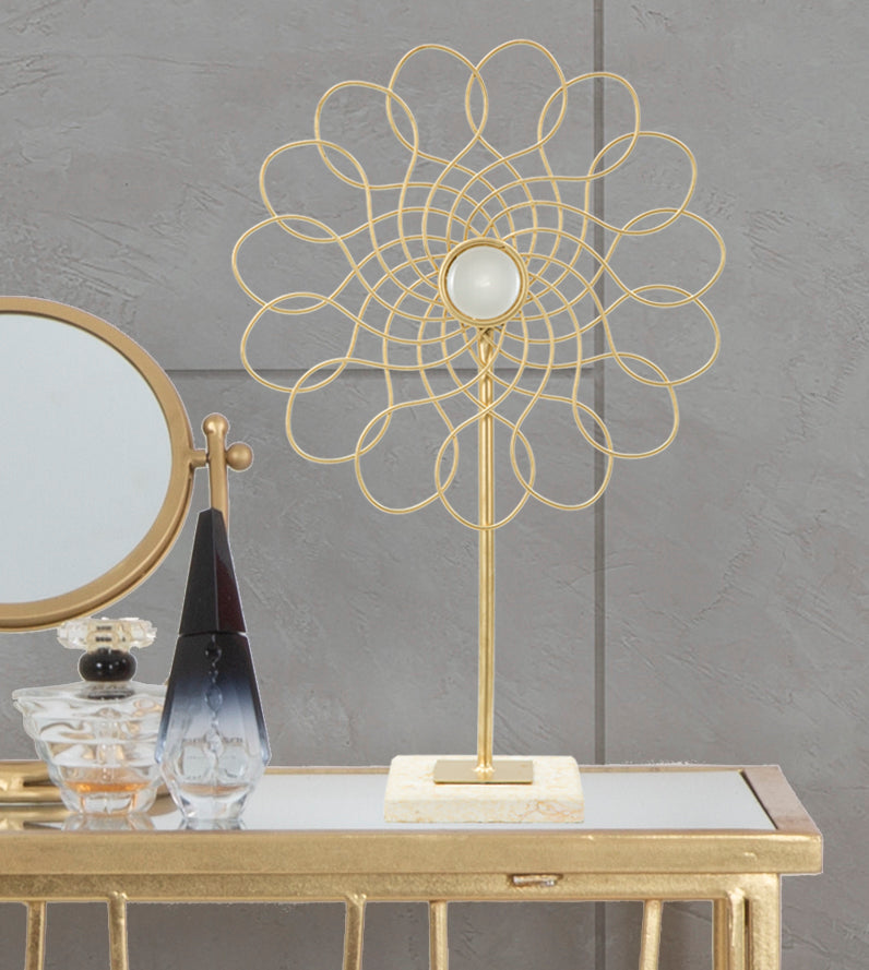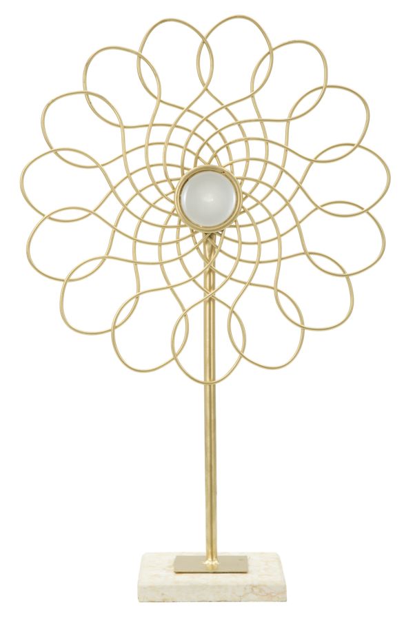 Décoration en métal avec socle en marbre caractérisé par des lignes géométriques et régulières. Les décorations dorées sont un élément essentiel pour donner une touche glamour à n'importe quel environnement. Parfait combiné avec des couleurs neutres telles que le blanc et le crème, audacieux et rétro lorsqu'il est combiné avec des couleurs fortes