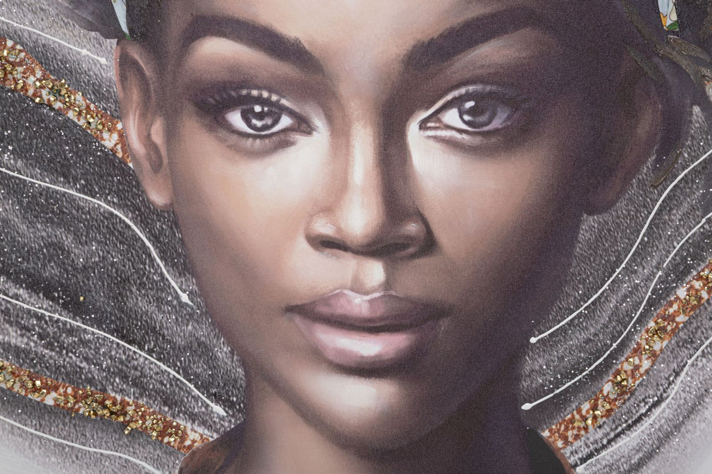 Questo dipinto su tela è caratterizzato da un raffinato telaio in legno che lo completa perfettamente. La sua raffigurazione è incentrata su un volto di donna, che viene reso ancora più elegante grazie alle applicazioni in tessuto che adornano l'opera. La delicatezza delle forme e dei dettagli conferisce al dipinto un'atmosfera di grazia e bellezza.