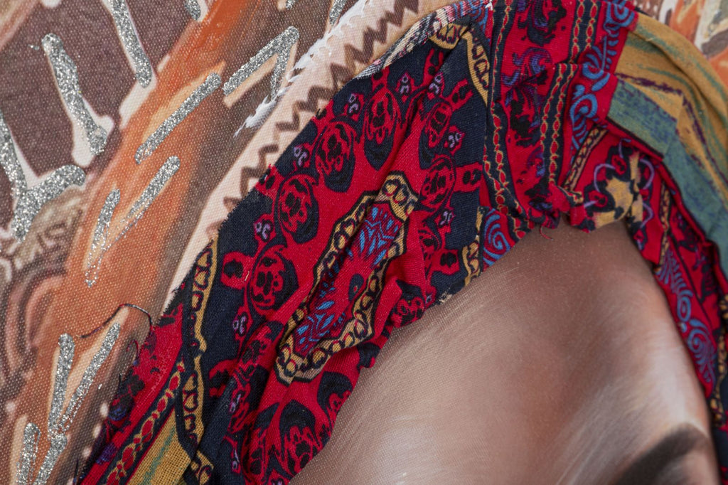 Questo dipinto su tela, incorniciato da un telaio in legno, presenta un ritratto seducente di una donna. Il suo volto è magistralmente rappresentato, con lineamenti delicati e un'espressione di mistero. Il copricapo che indossa è adornato con eleganti applicazioni in tessuto, che aggiungono un tocco di raffinatezza e sofisticatezza all'immagine. L'intera composizione trasmette un senso di bellezza, grazia e fascino senza tempo.