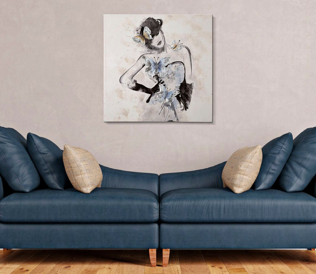 Questo dipinto su tela, montato su un solido telaio in legno, rappresenta una stupenda immagine di una donna. Il suo abito è realizzato in modo unico, poiché è composto da farfalle che sembrano emergere dalla superficie stessa della tela. Questo elemento dà un senso di leggerezza e movimento all'intera composizione. La donna sembra essere avvolta dalla bellezza e dalla delicata eleganza di questi insetti volanti, creando un'atmosfera affascinante e suggestiva.