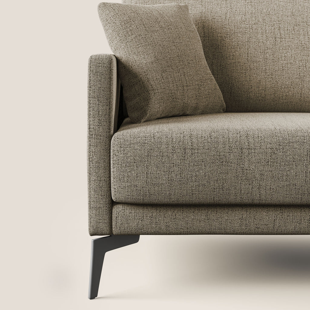 Il divano è realizzato in morbido tessuto impermeabile, dotato di piedini in acciaio nero alti 17 cm. È completamente sfoderabile e disponibile in 11 colori e diverse misure, adattandosi a ogni esigenza di spazio e design. Questo divano, prodotto al 100% in Italia, si distingue per la sua pregiata manifattura artigianale e per l'utilizzo di materiali di qualità, selezionati con attenzione e nel pieno rispetto dell'ambiente. Il tessuto water-repellent, facilmente lavabile in lavatrice a 30°, è ribattuto e cucito con una doppia lavorazione che evidenzia l'eccellenza della lavorazione sartoriale. Il divano offre inoltre una facile sfoderabilità totale, grazie alla quale è possibile mantenerlo sempre pulito e in ordine. La seduta e lo schienale, realizzati con materiali ad alta densità e indeformabili, garantiscono un elevato comfort. In sintesi, il divano rappresenta un mix di eleganza, funzionalità e qualità artigianale.