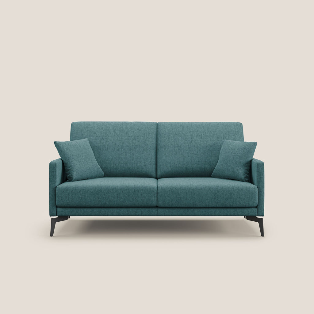 Il divano è un elegante e confortevole divano composto da un modulo da 3 posti e uno da 2 posti. Realizzato in morbido tessuto impermeabile, presenta piedini in acciaio nero, alti 17 cm. Questo divano si distingue per essere completamente sfoderabile, offrendo la possibilità di scegliere tra 11 diversi colori e varie misure per adattarsi ad ogni spazio e stile di arredamento. Realizzato al 100% in Italia, questo divano è impreziosito dalla manifattura artigianale, che si riflette nella selezione di materiali di alta qualità, nel tessuto water-repellent facilmente lavabile, nella ribattitura del tessuto cucito e nella sfoderabilità totale che semplifica la sua manutenzione. Inoltre, la seduta e lo schienale presentano un'alta densità di materiali indeformabili, garantendo un comfort duraturo. Il modello è la scelta ideale per chi cerca un divano di qualità, dal design raffinato e made in Italy.